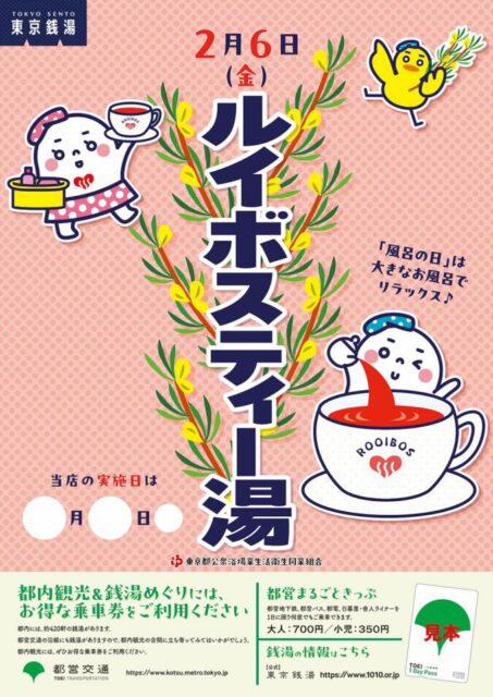 世田谷区の各銭湯では、来たる2月6日(金)、風呂の日に「ルイボスティー湯」を実施いたします。